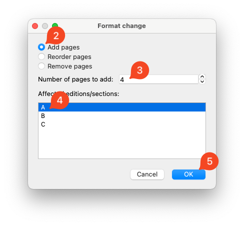 - Change format - The Format change function is used to add, remove, or reorder pages within an edition/section. There is a correlating menu entry under Actions → Change format