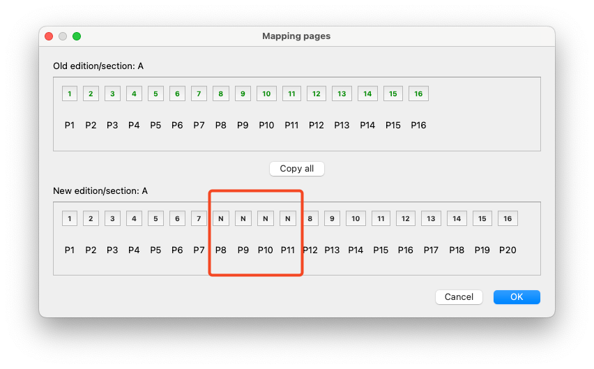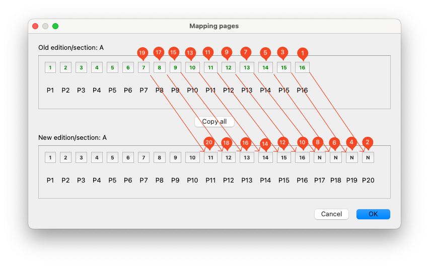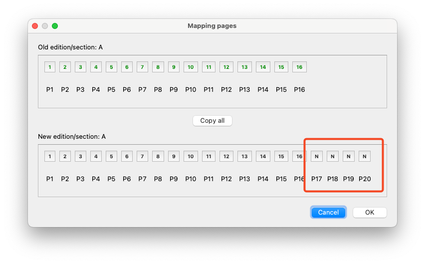 The user will map the new positions of the original pages following the expansion. To do this, the user should first click on a page in the “Old” edition/section, then click on the corresponding page in the “New” edition/section. It is easiest to start from the end of the section and work backward, effectively shuffling the new pages into the book.